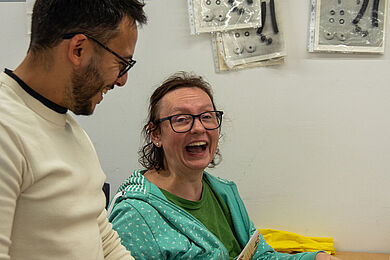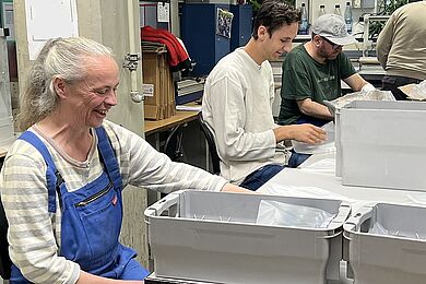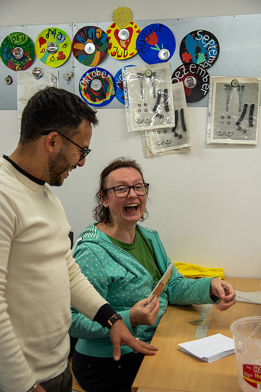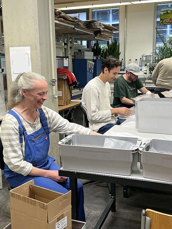 Zu Ihnen gehört auch Michaela Schneider. In ihrer Funktion als Reha-Beraterin der Agentur für Arbeit Leipzig steht sie in engem Austausch mit der Diakonie am Thonberg und hat bereits zahlreiche Klient*innen erfolgreich auf diesem Weg begleitet. Beim Schichtwechsel konnte sie selbst mit anpacken, Tätigkeiten in Montage und Verpackung ausprobieren und so einen direkten Einblick in den Arbeitsalltag gewinnen. Besonders beeindruckt hat Michaela Schneider die offene und wertschätzende Atmosphäre im Team: „Schon beim ersten Kennenlernen war die Atmosphäre sehr herzlich. Das Team war neugierig, wer da neu dazukommt und ich wurde offen und freundlich aufgenommen.“